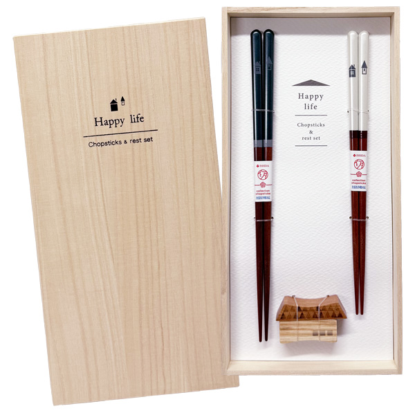 カップルへの贈り物にピッタリな桐箱入り夫婦箸と箸置きのセットです。