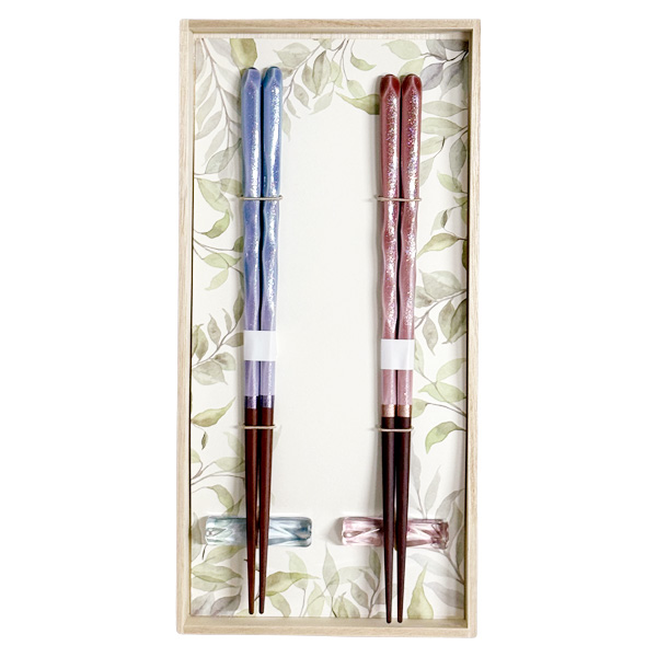 カップルへ感謝の贈り物にピッタリな桐箱入り夫婦箸と箸置きのセットです。