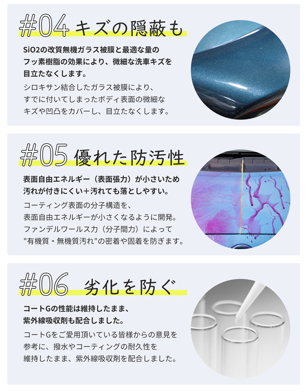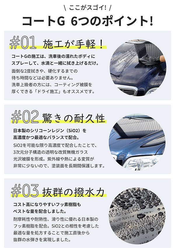 失敗する事がないので極限まで中身を高濃度にする事が可能になり、深い艶、撥水性、強いコーティング膜を実現しました。