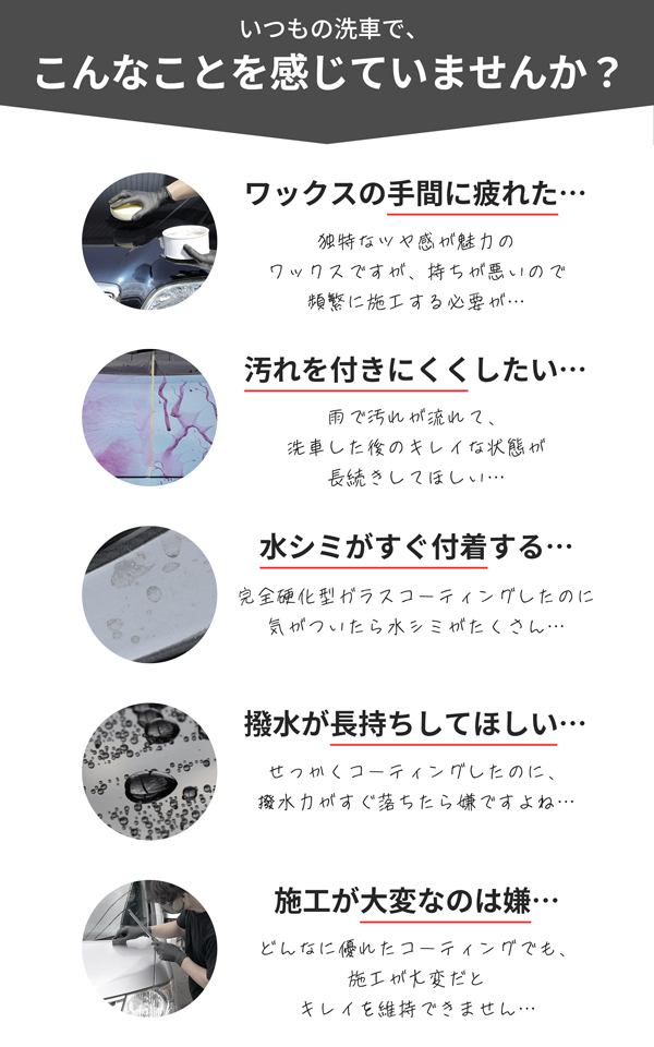 【注意があります。】本商品は高濃度で作っている為、使い方によっては拭きあげ時に抵抗があったり濃色車の場合ムラになりやすかったりします。