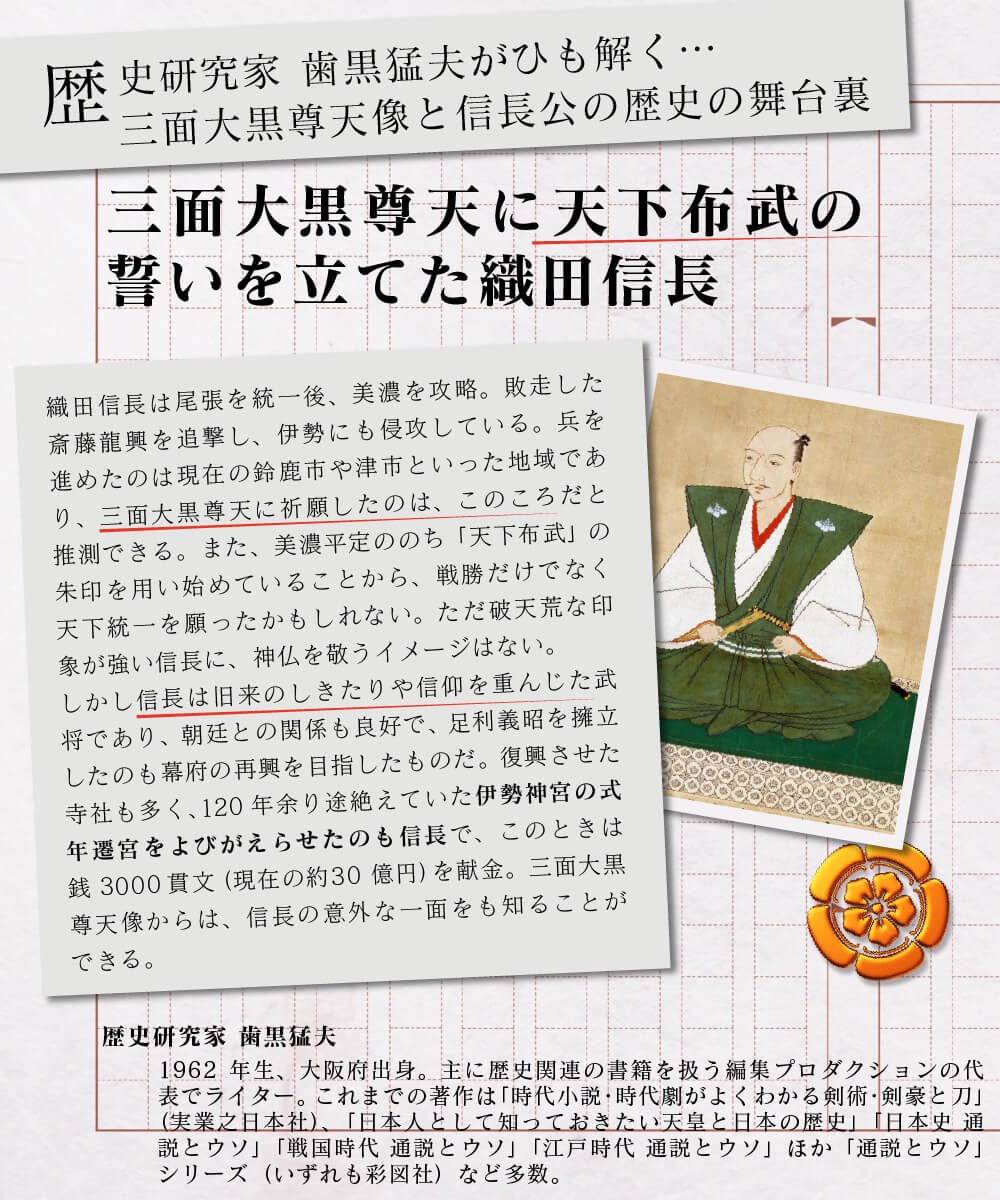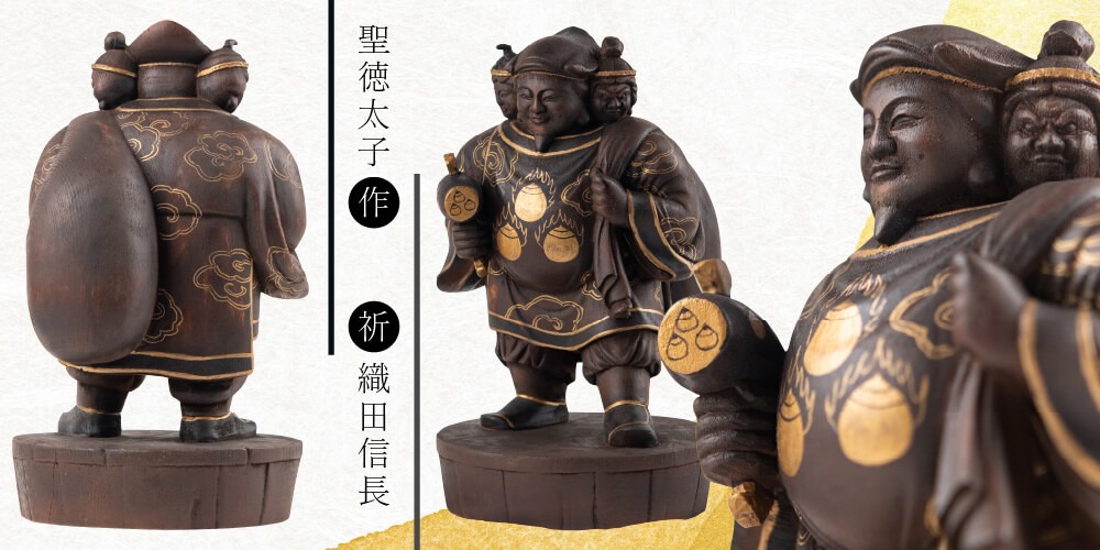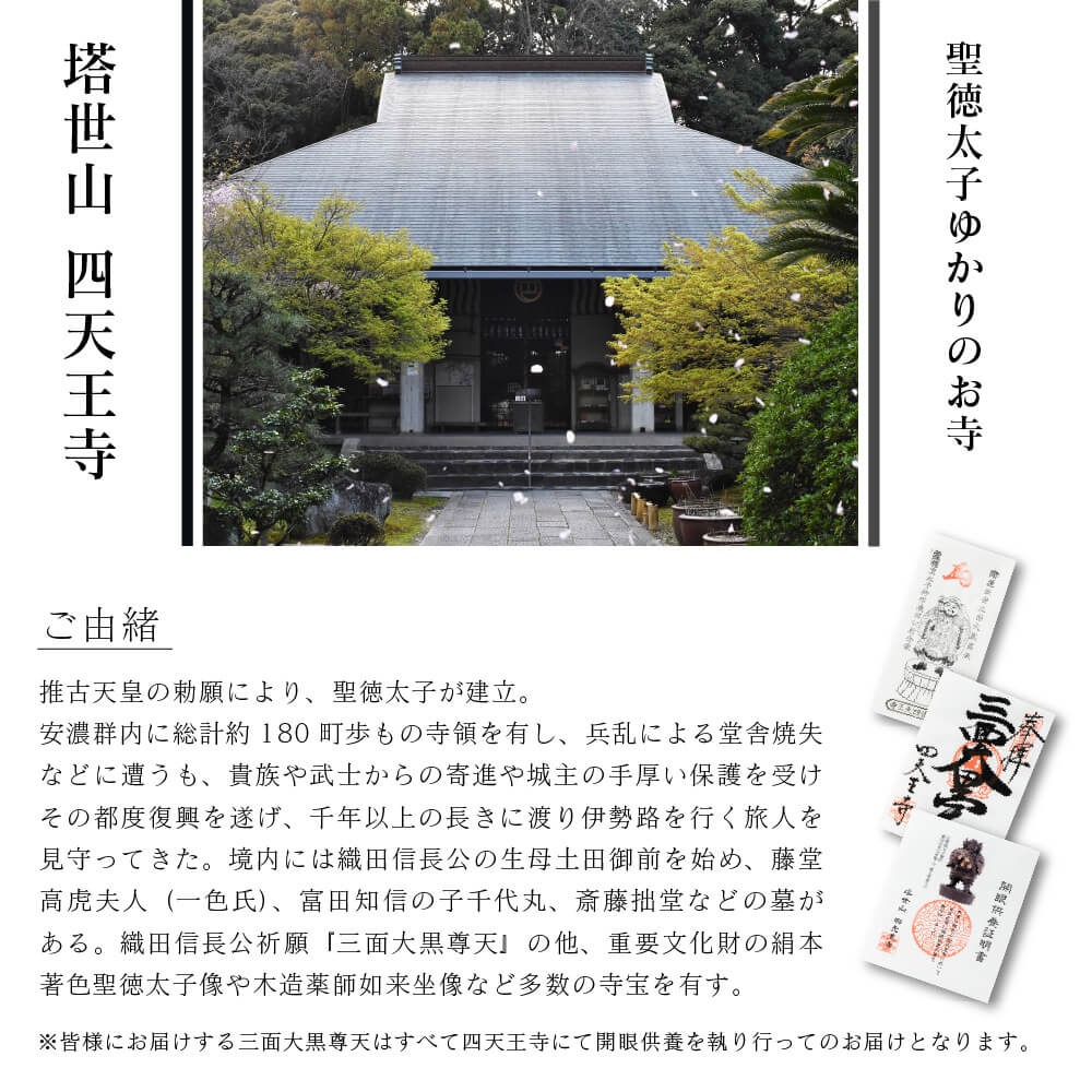 織田信長公が天下統一を祈願した聖徳太子御作と伝わる尊像を忠実に再現!推古天皇の勅願により、聖徳太子によって建立された塔世山四天王寺(三重県津市)には、織田信長公が祈願したと伝わる『三面大黒尊天』が所蔵されています。この像は、寺に遺る明治時代の版木によれば聖徳太子御作と伝承される由緒ある像です。本作品は四天王寺の認証を得て実像の3Dスキャンを実施。それにより作成された精密データを元に忠実に再現された木彫像です。更に所蔵寺院により一体一体ありがたい開眼供養を賜り、その証となる開眼供養証明書と2枚の御札(姿札、御朱印)が付属します。聖徳太子と織田信長、歴史的英傑所縁の歴史ロマン溢れる逸品。コロナ禍を強く生き抜く誓いの守護本尊として是非お祀りください。