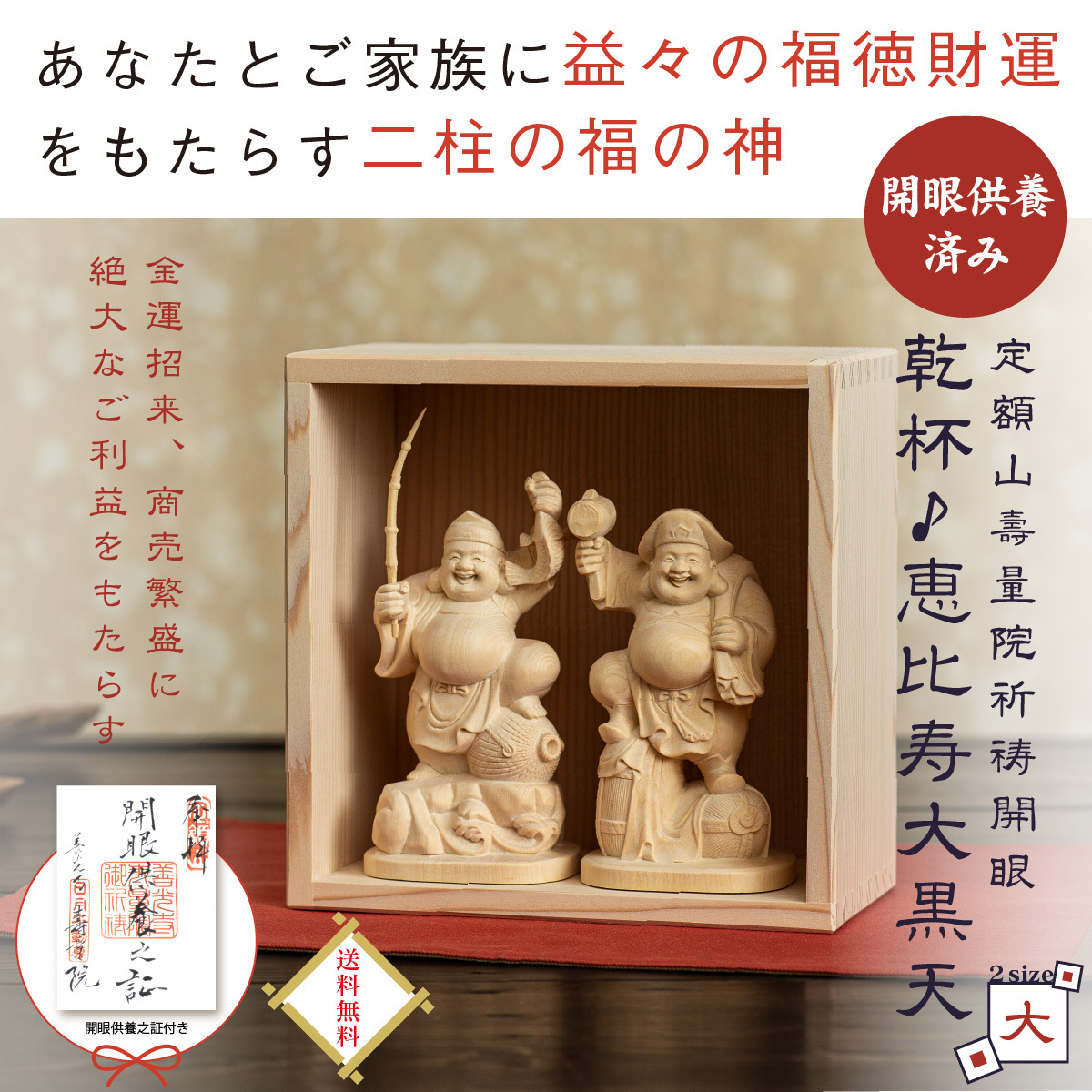 信州の古刹「定額山壽量院」にて祈祷開眼。あなたとご家族に益々の福徳財運をもたらす二柱の福の神!!古来、多幸をもたらす福の神として人々から信仰されてきた七福神。中でも恵比寿と大黒天は七福神を代表する二柱として知られます。イザナギとイザナミの最初の子として純粋な日本の神とされる恵比寿と、ヒンドゥー教のシヴァ神に由来する大黒天は、ともに商売繁盛、福徳財運など富にまつわるご利益があることから、商工民の間では二尊並べて信奉する習慣がありました。