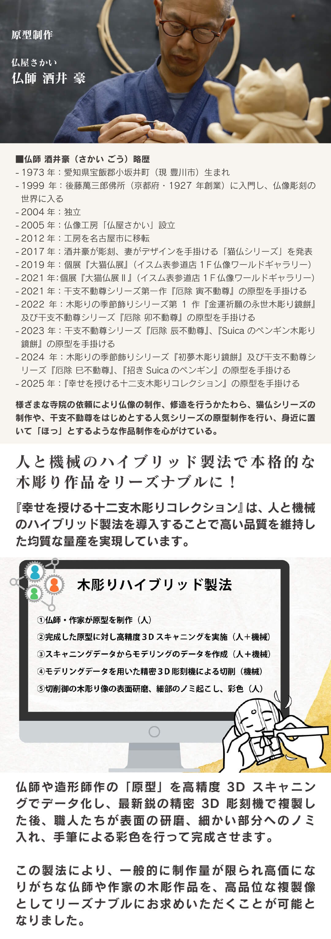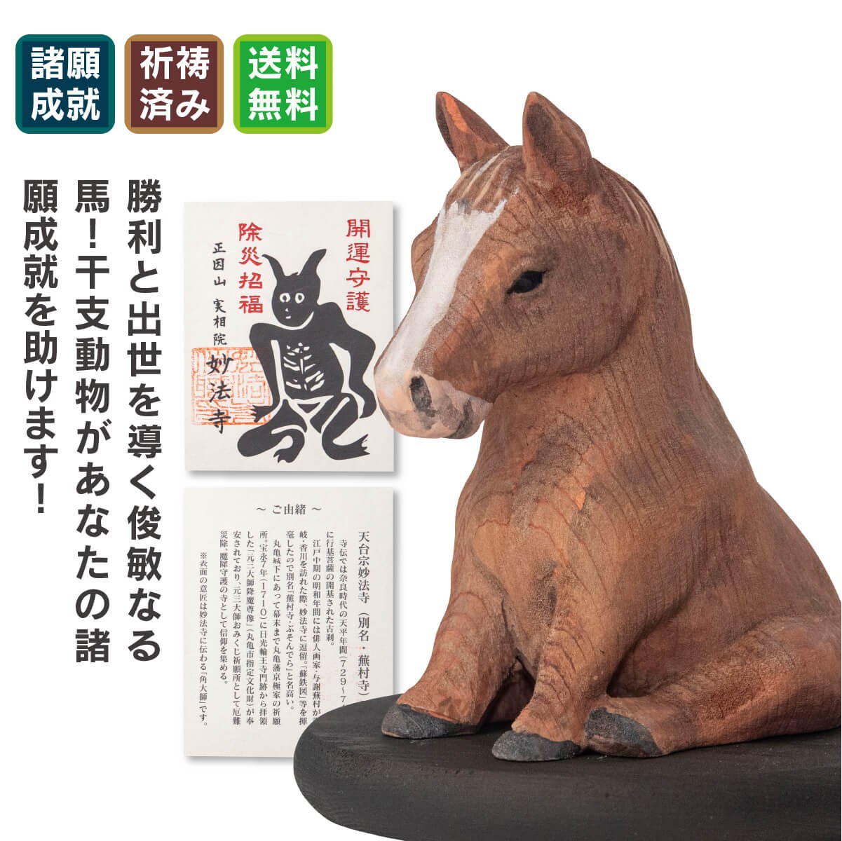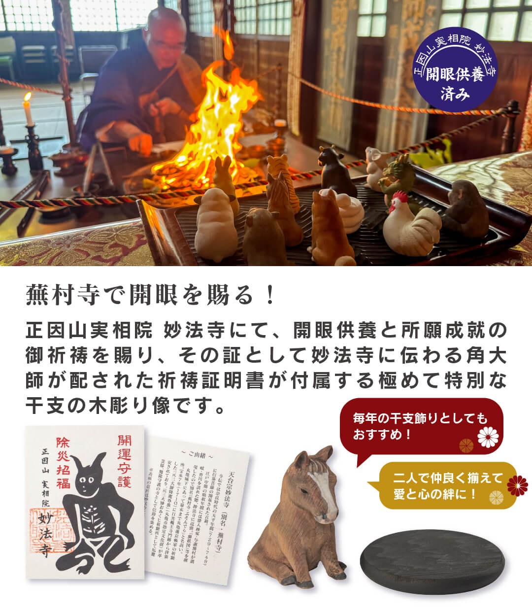 馬は俊敏と勝利の象徴。出世や良縁をもたらし、人生を力強く前進させる守護の存在です。蕪村寺として有名な妙法寺様に祈祷をいただいた特別な一体です。