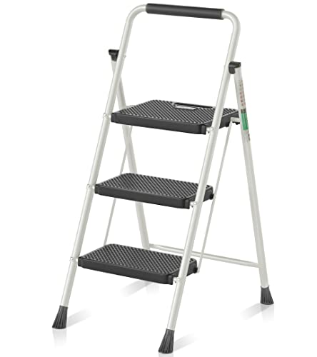 RIKADE 脚立 はしご 鉄素材 持ち運び便利 持ち手付き 軽量 折りたたみ脚立 踏み台 滑り止め付き ステップ台(ホワイト, 三段)