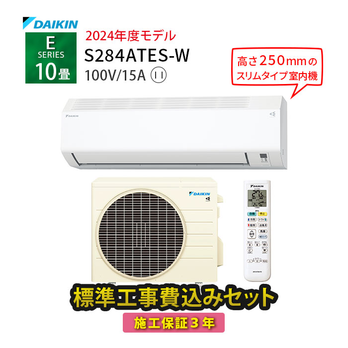 エアコン ダイキン 10畳 工事費込 冷暖房 コンプレッサー 単相100V 施工保証3年 Eシリーズ S284ATES-W スリムタイプ コンパクト