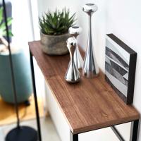 玄関、廊下、リビングなど、ちょっとした置き場所が欲しい時に便利なコンソールテーブル。奥行き約18cmのスリム設計で置く場所を選ばず、観葉植物やオブジェを飾ったり、鍵などの小物の収納に。天然木とスチールを組み合わせた、シンプルでスタイリッシュなデザイン。