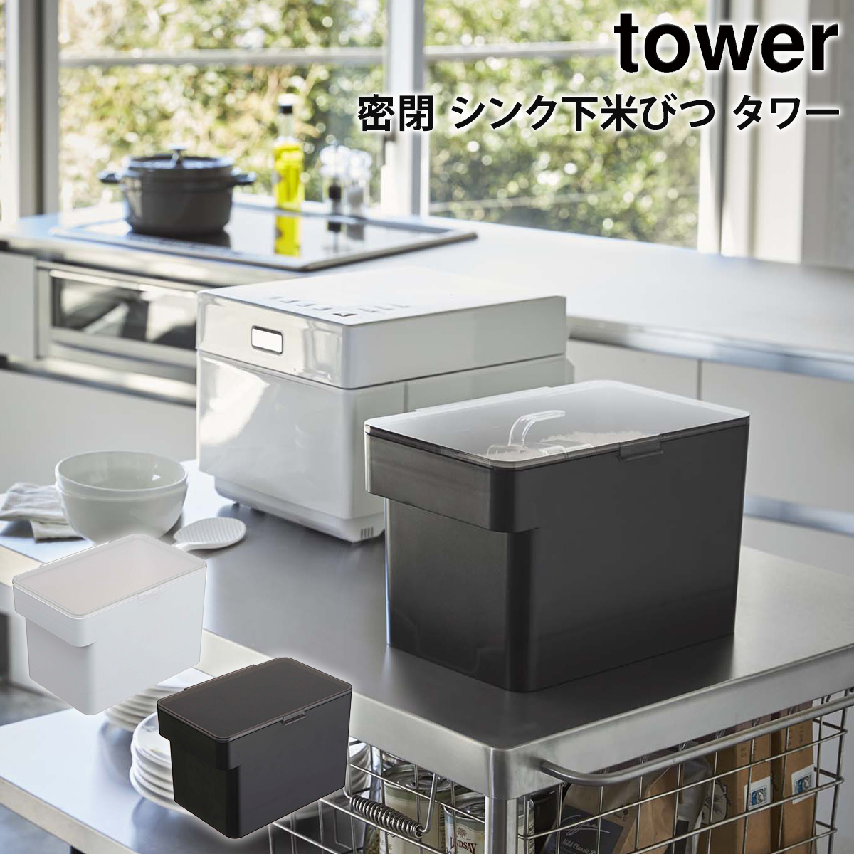 密閉 シンク下米びつ タワー tower 5kg 山崎実業 yamazaki 軽量カップ付き 透明蓋 隙間収納 キッチン収納 シンク下