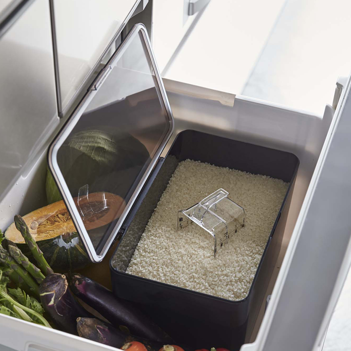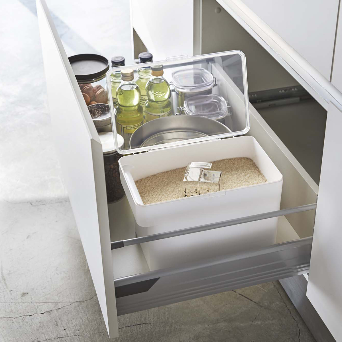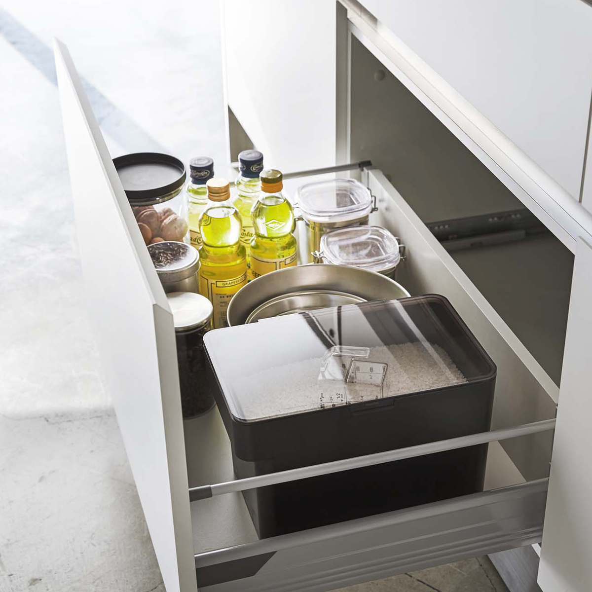 無駄のないフォルムなので、置き場所に困りがちな米びつもこれでスッキリ綺麗に収納できます。もちろん、入れたままで使う事が可能です。引き出しに入れないで使用しても米びつと分からないスタイリッシュさです。