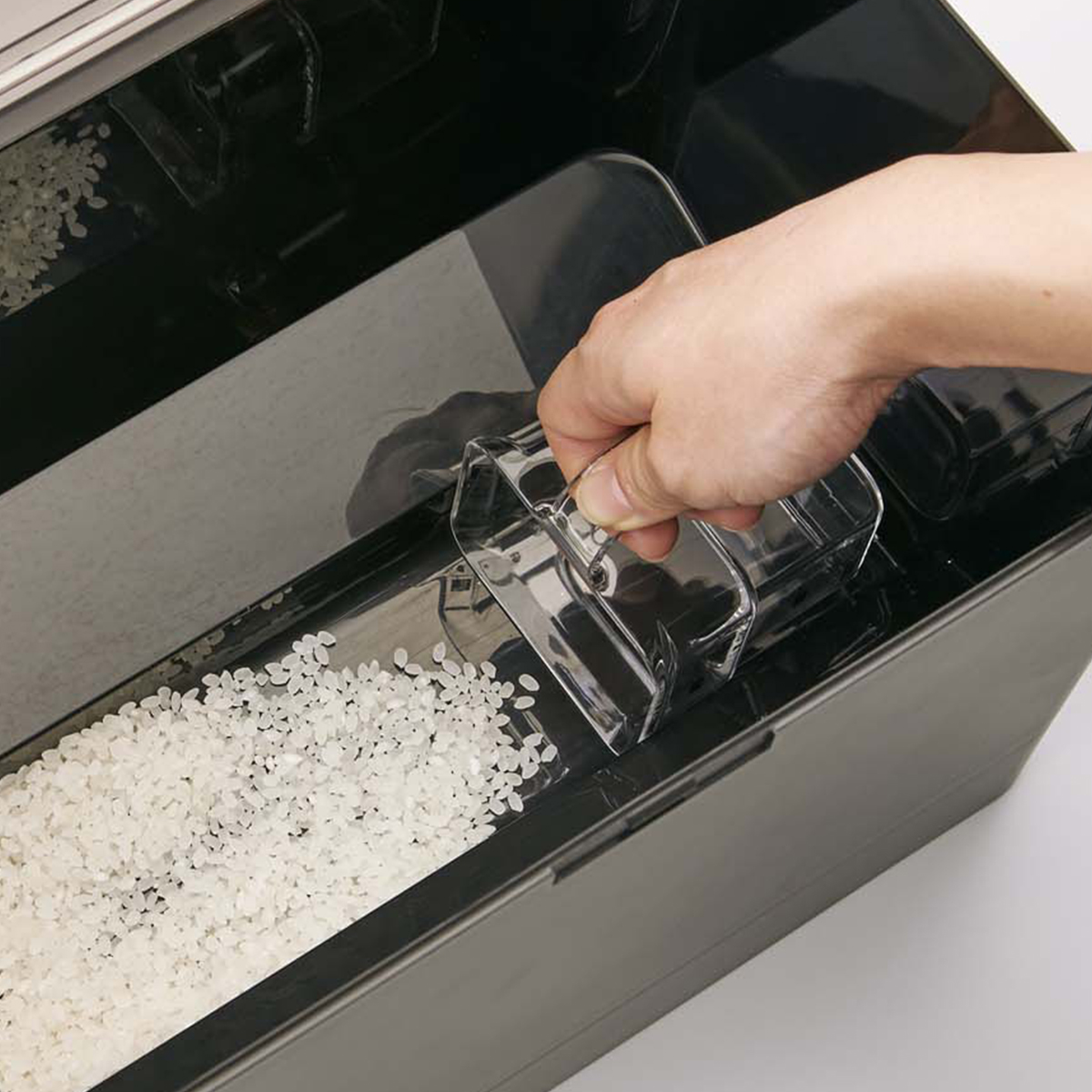 お米が最後まで綺麗にすくえる、お米ごっそりライン付きのスタイリッシュなデザインの米びつです。