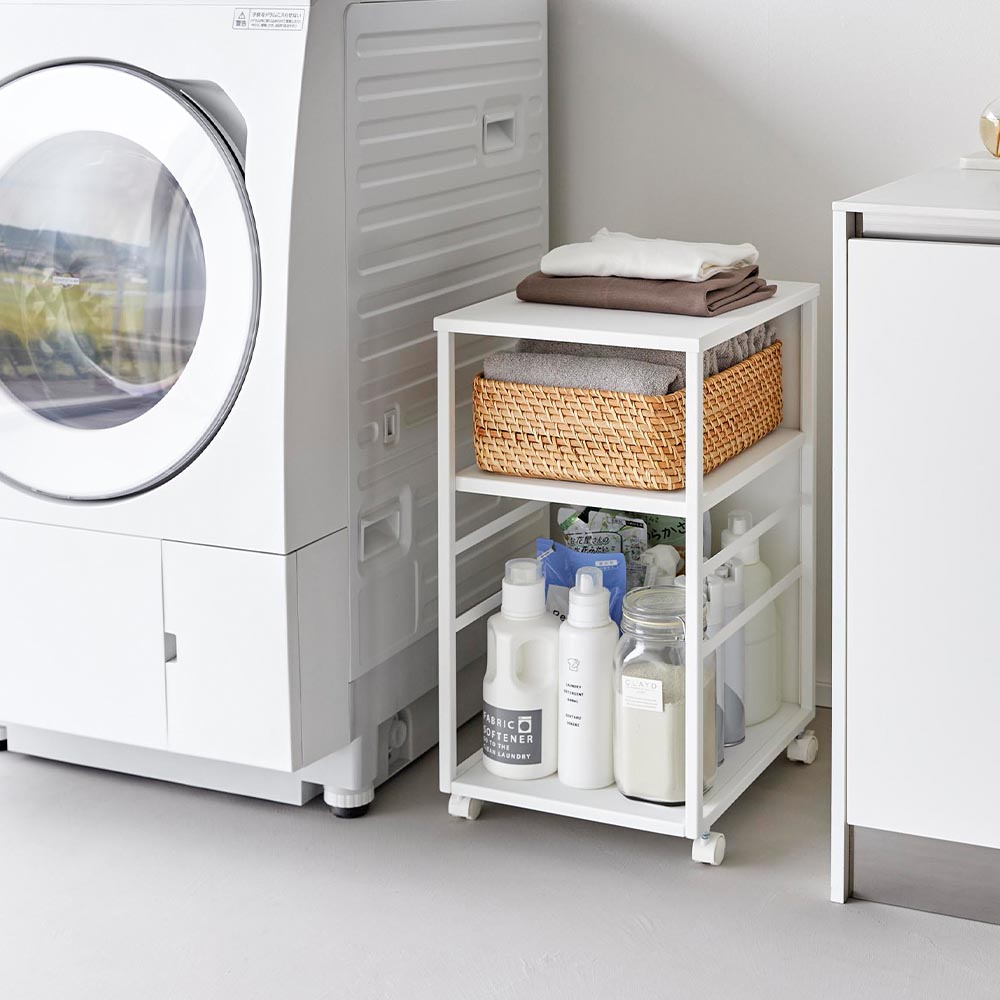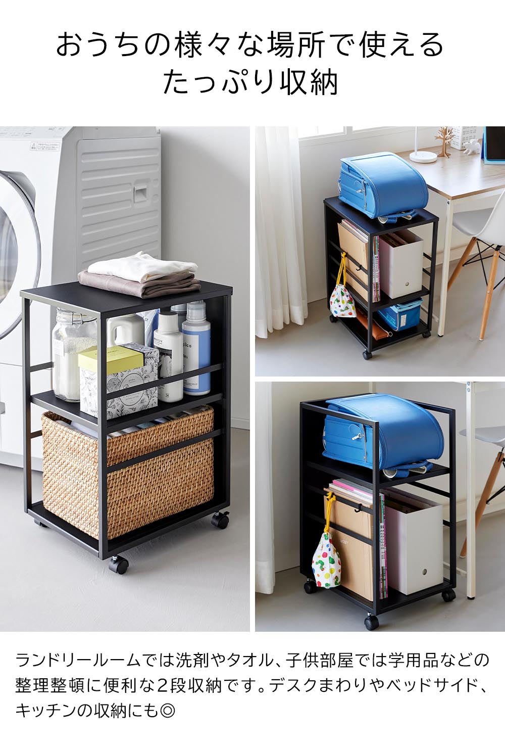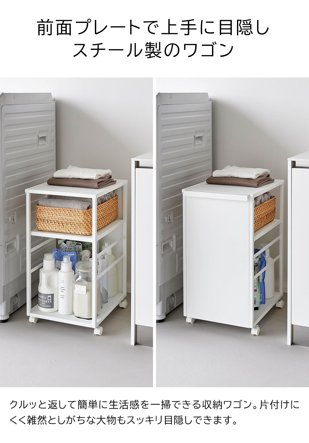 かさばる物や細かな物をプレートで目隠ししながら一括収納できる、キャスター付きスチール製ワゴンです。キャスターとハンドルで移動もラクにできます。 シンプルで場所を選ばないデザインのため、キッチン・ランドリールーム・子供部屋など幅広く活躍します。 2段の収納スペースに洗剤ストック、ペット用品、学用品やおもちゃなどをまとめて収納でき、お部屋がすっきり整います。天板は一時置きにも便利。 棚板は3本あるサイドバーの中から好みの位置を選んで設置でき、収納物に合わせてカスタマイズ可能です。 天板は取り外しでき、用途に合わせて使い分けできます。