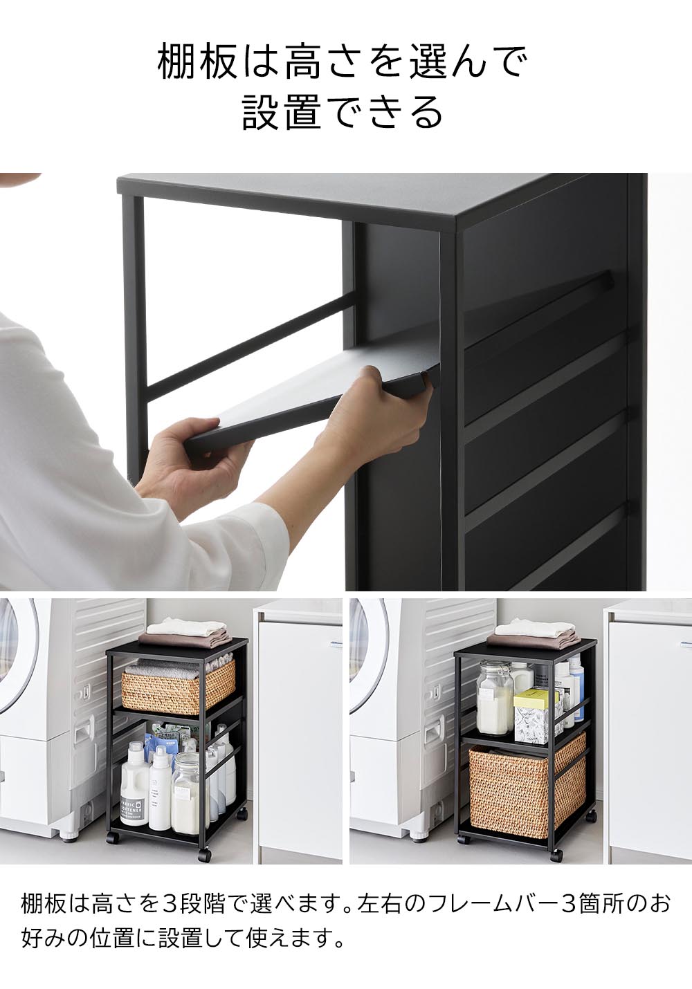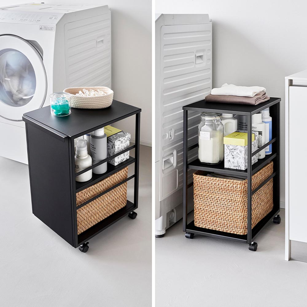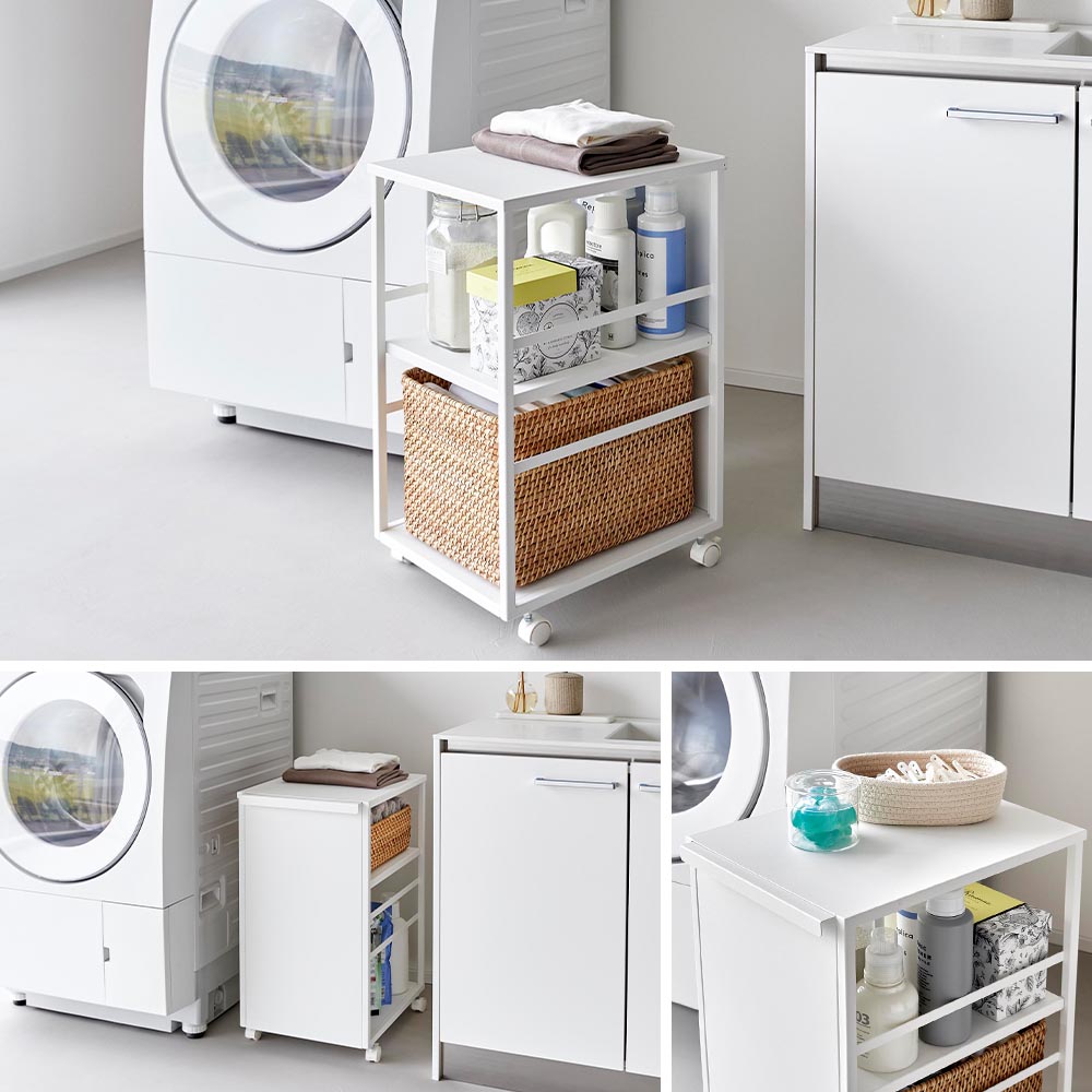 かさばる物や細かな物をプレートで目隠ししながら一括収納できる、キャスター付きスチール製ワゴンです。キャスターとハンドルで移動もラクにできます。 シンプルで場所を選ばないデザインのため、キッチン・ランドリールーム・子供部屋など幅広く活躍します。 2段の収納スペースに洗剤ストック、ペット用品、学用品やおもちゃなどをまとめて収納でき、お部屋がすっきり整います。天板は一時置きにも便利。 棚板は3本あるサイドバーの中から好みの位置を選んで設置でき、収納物に合わせてカスタマイズ可能です。 天板は取り外しでき、用途に合わせて使い分けできます。
