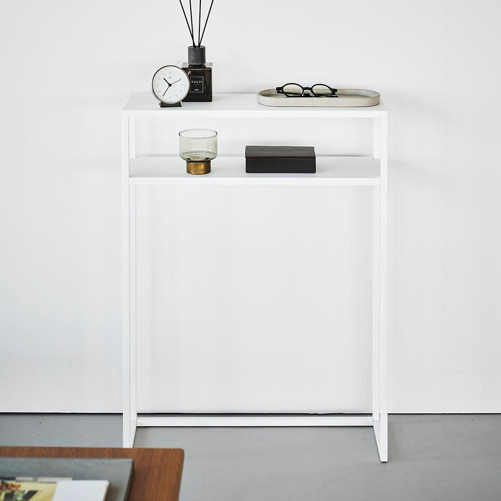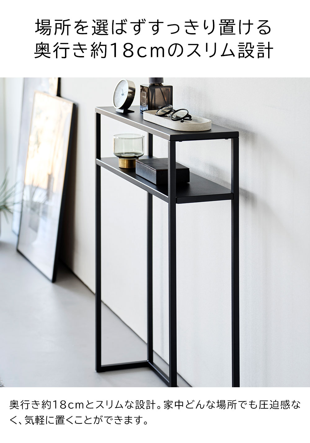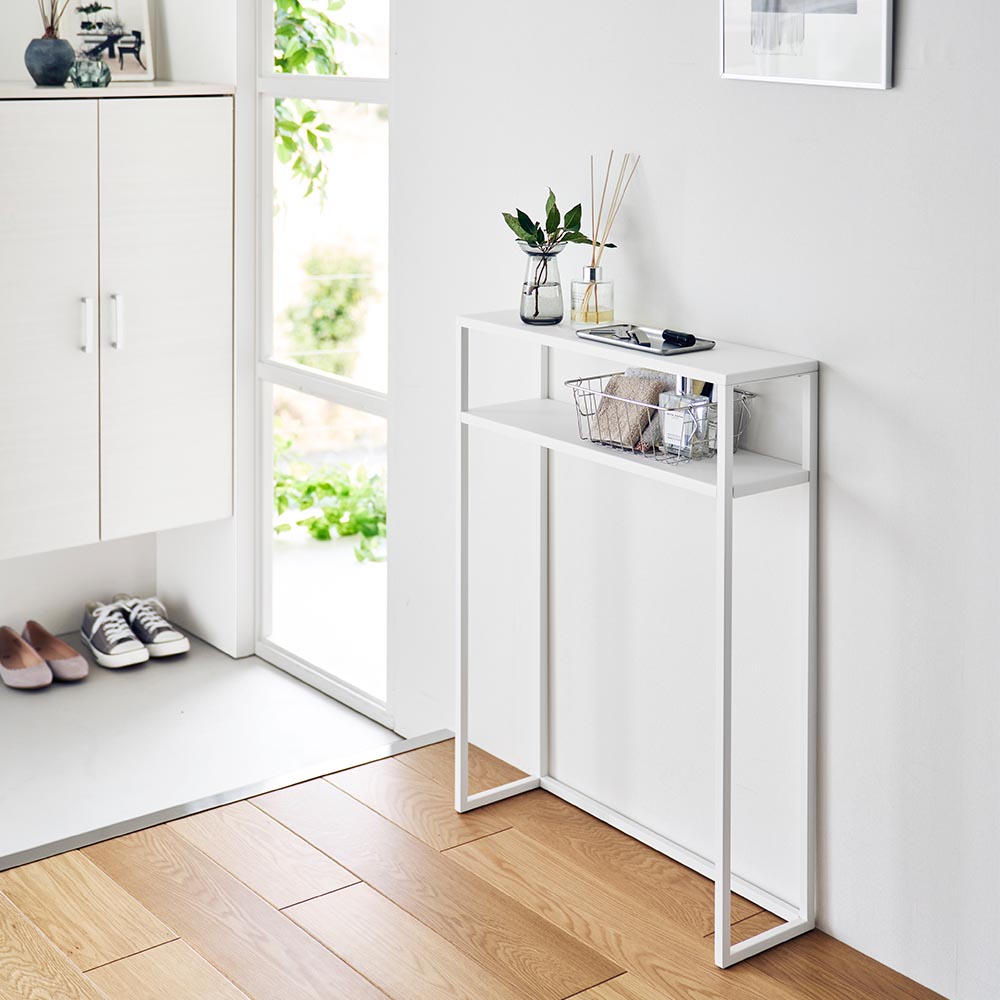 玄関や廊下、リビングなど、飾り棚や収納棚として家中で活躍するマルチな棚付きのコンソールテーブルです。奥行き約18cmとスリムな設計で、置く場所を選ばずすっきりと設置できます。天板と棚付きなので、観葉植物やオブジェを飾ったり、眼鏡や鍵のちょい置きをしたり、細々とした小物を入れたかごを収納したりと、様々な使い方ができます。また、立ったままでも物が置きやすく手に取りやすい高さなのも◎ マグネットがくっつくスチール製なので、お手持ちのマグネットフックなどを活用すれば、エコバッグやペットのお散歩グッズなどを引っ掛けて収納できます。シンプルでスタイリッシュなデザインで、どんな空間にも自然に馴染みます。