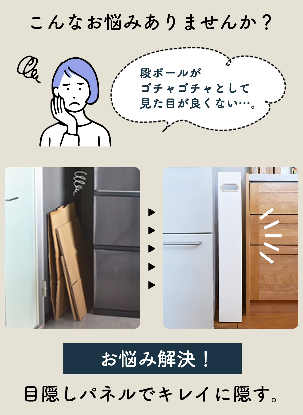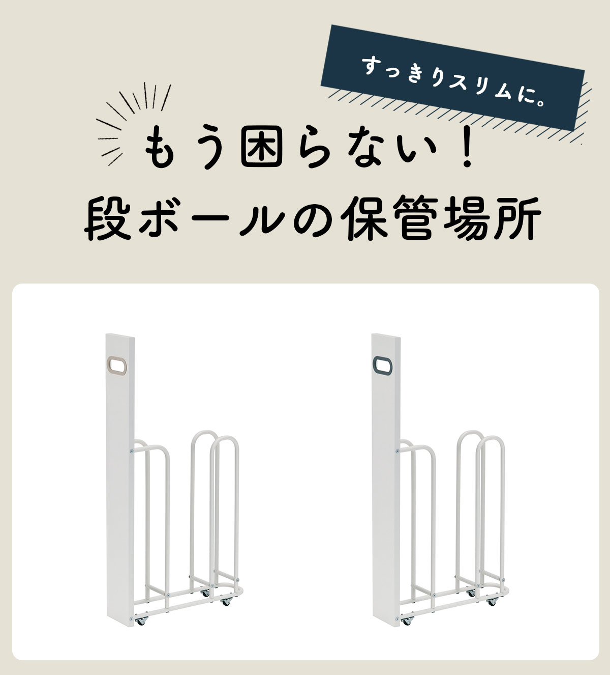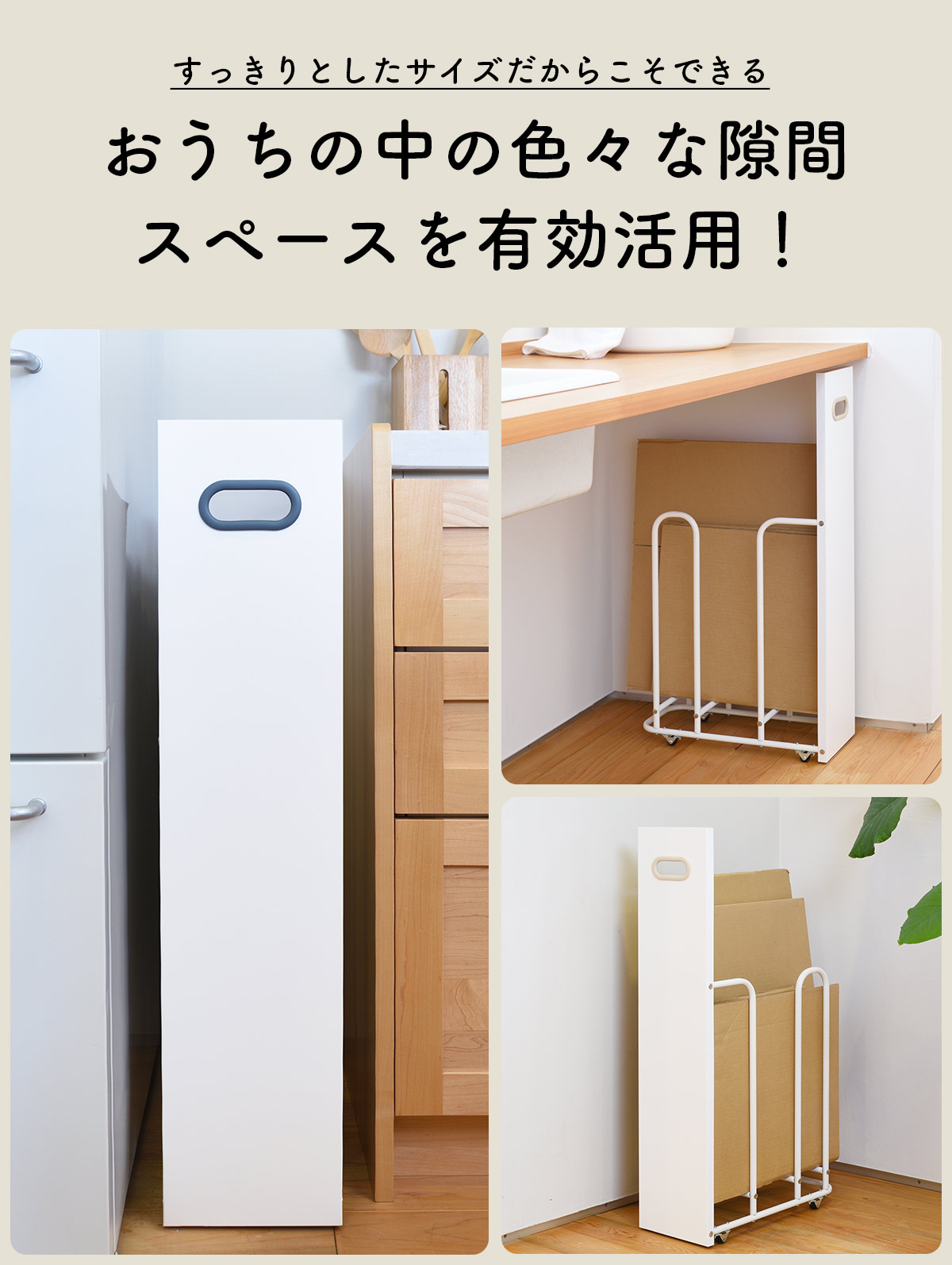| ご注意点 | ・組立式( プラスドライバーを別途ご用意ください。 ) ・本体の奥行きサイズより大きいダンボールを収納すると、隙間スペースより奥行きがはみ出てしまう場合があります。 ・壁や冷蔵庫などの隙間で使用する際は、サイドのネジで傷をつける恐れがありますので、ギリギリの幅の場所では使用せず、幅に若干の余裕がある場所で使用してください。 |