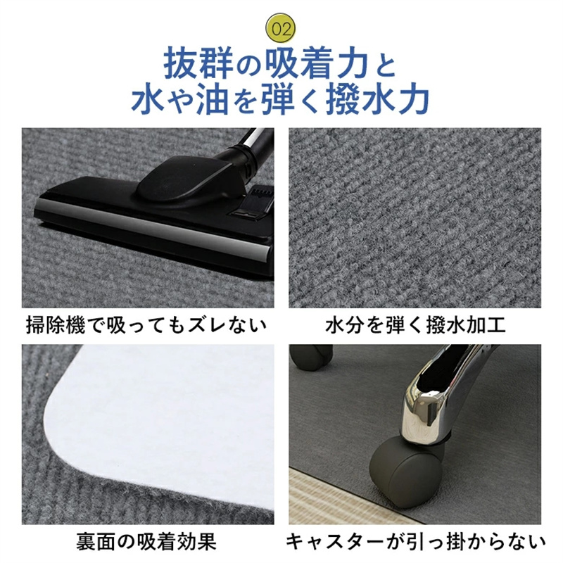 ・キャスター、家具、走り回る犬や猫などが床に直接触れるのを防ぎ、傷はもちろん長期間の利用でこびりついてしまう汚れも防いでくれます。