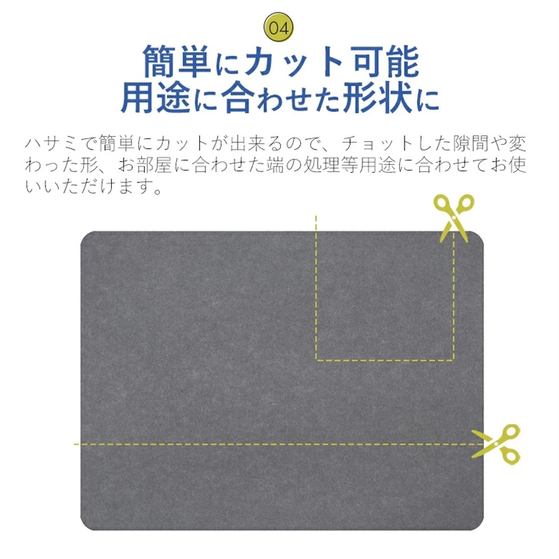 ・裏はずれない吸着加工、無数の吸盤ができたようにくっつく仕組みでシールを剥がして貼るだけピタックと床に密着。