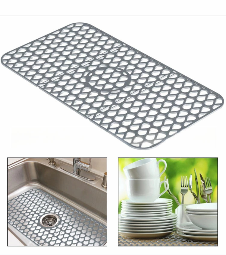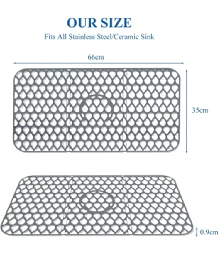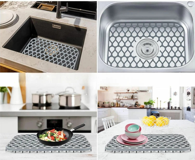 シリコン素材のマットはしなやかで、フライパンや金属や磁器の鍋の傷からステンレスや磁器のシンクを効果的に保護し、セラミックシンクで皿が割れるのを防ぎます。防錆素材は耐久性に優れています。