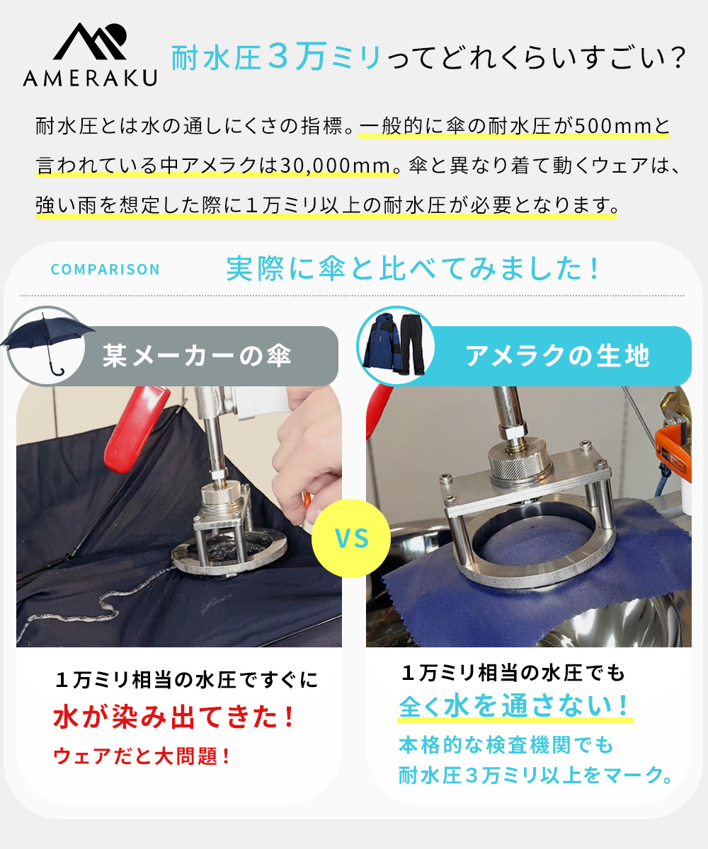 高い耐水圧で水が染みないため台風・豪雨・大雨などの際の防災グッズにもおすすめです。