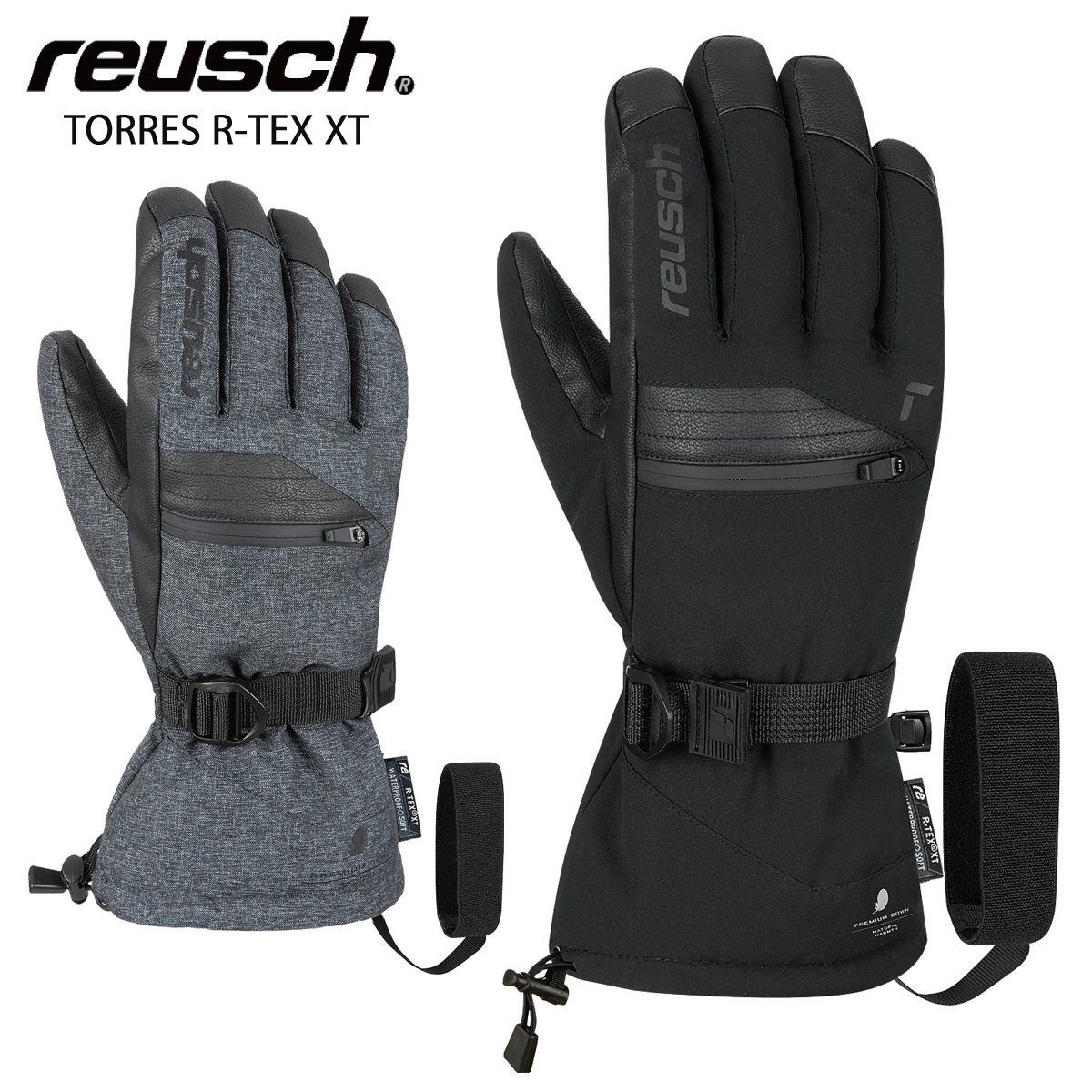 ・R-TEX XT:reusch独自のストレッチ性のある防水、防風、透湿シート。摩耗に強く頑丈で、高い伸縮性と通気性を併せ持つ素材。手をドライに保ち、快適な温度を生み出す。