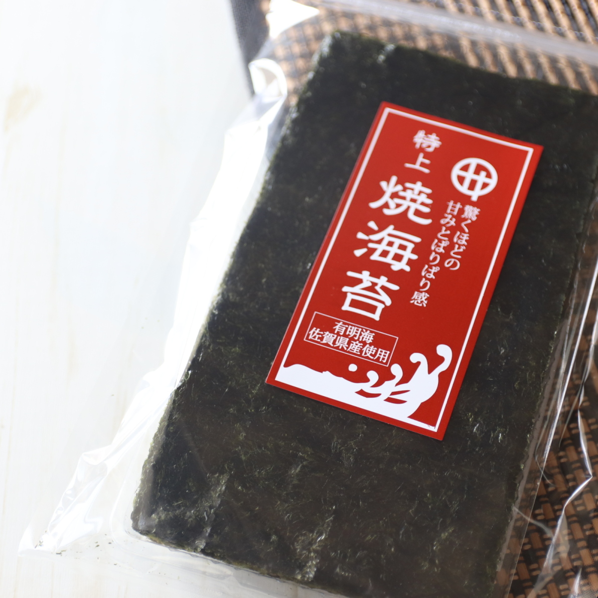 高級寿司屋さんご用達、当店最高クラスの焼海苔です。佐賀県産特有の濃い海苔の味と、ぱりぱりの食感、口どけも素晴らしいです。