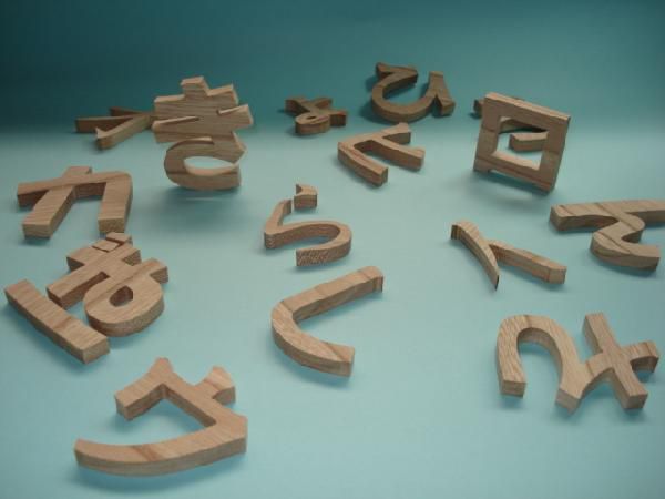 必要なひらがな、カタカナの文字を銘木中の銘木、欅の1枚板から贅沢に切り出します。作り置きの文字をばらばらで販売するのではありません。ご注文いただいてから製作する受注生産品です。可能な限り木目を通す事ができますので、見た目に美しいです。