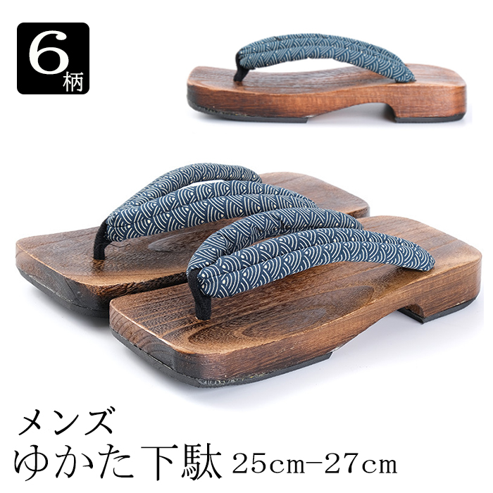 ・メンズ用 お洒落な浴衣下駄です。・和柄や無地、スタイリッシュな英字デザインなど全部で6柄ございます。・鼻緒部分はソフトでふっくらとした素材で出来ており痛くなりにくいです。・台の裏はゴム張りで滑りにくくなっております。・花火大会、夏祭り、盆踊りなど、夏のお祭りにぜひオススメです。