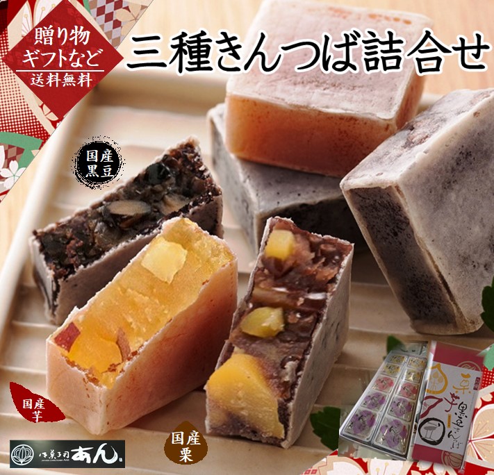 【栗きんつば】大納言小豆(国内製造)、小豆こし餡(小豆・砂糖)、蜜漬栗、砂糖、白玉粉、寒天、小麦粉、植物油脂、食塩 (一部に乳成分・小麦を含む)【芋きんつば】さつま芋(国産)、白餡(ライマメ、砂糖、水飴)、砂糖、白玉粉、小麦粉、寒天、植物油脂、澱粉、食塩/トレハロース・ソルビトール(一部に乳成分・小麦を含む)【黒豆きんつば】小豆こし餡(小豆・砂糖)(国内製造)、蜜漬黒大豆、砂糖、白玉粉、寒天、小麦粉、食塩、植物油脂 (一部に乳成分・小麦を含む)