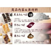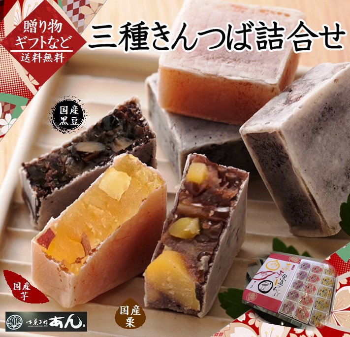 【栗きんつば】大納言小豆(国内製造)、小豆こし餡(小豆・砂糖)、蜜漬栗、砂糖、白玉粉、寒天、小麦粉、植物油脂、食塩 (一部に乳成分・小麦を含む)【芋きんつば】さつま芋(国産)、白餡(ライマメ、砂糖、水飴)、砂糖、白玉粉、小麦粉、寒天、植物油脂、澱粉、食塩/トレハロース・ソルビトール(一部に乳成分・小麦を含む)【黒豆きんつば】小豆こし餡(小豆・砂糖)(国内製造)、蜜漬黒大豆、砂糖、白玉粉、寒天、小麦粉、食塩、植物油脂 (一部に乳成分・小麦を含む)