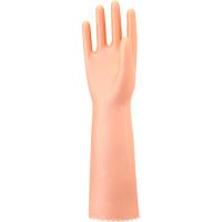 ●手袋の厚みと裏毛のバランスを工夫し、やさしいフィット感に仕上げたMサイズの塩化ビニール製手袋、色はパールオレンジです。