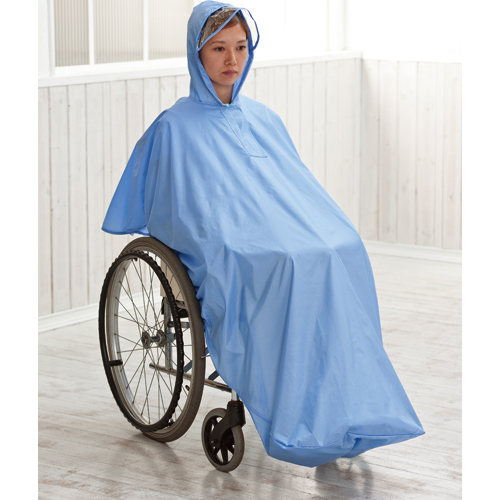 メーカー:日本エンゼル 品番:9096 ブル- まとわりつかず、タイヤへの巻き込みの心配もない、車いす用雨具。