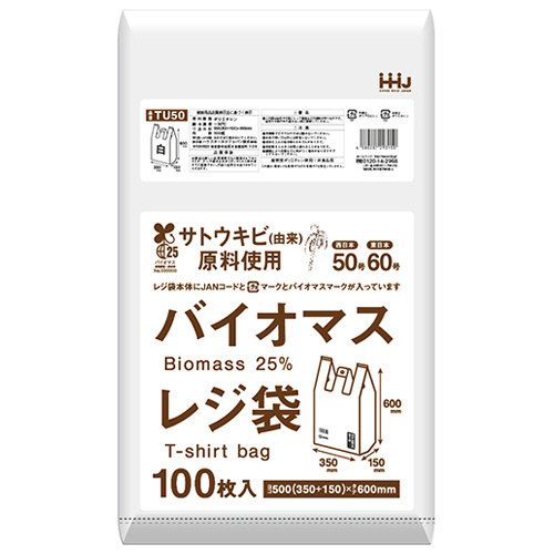 メーカー:ハウスホールドジャパン 品番:TU50 バイオマス配合25%のレジ袋です。