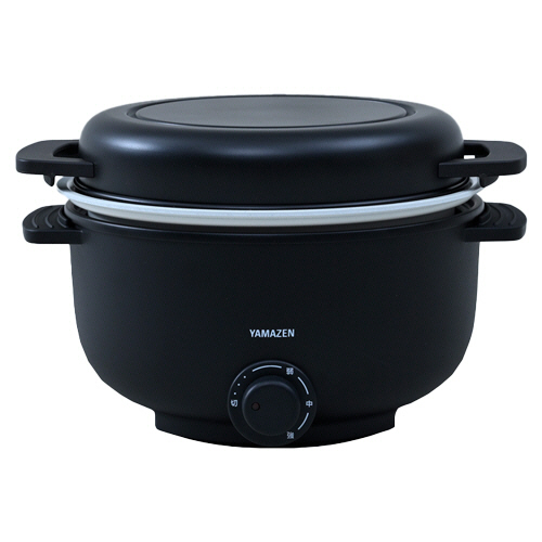 メーカー:YAMAZEN 品番:JYMCP-S650(B) 「揚げ」調理など1台5役!ふたがバット替わりに! <セット内容>温度調節はダイヤル式。<イメージ>
