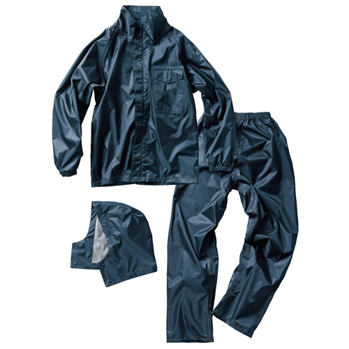 ●環境負荷低減非フッ素撥水剤を使用、耐水圧10000mmH2Oのレインスーツ。LLサイズ・ネイビーの上下セットです。