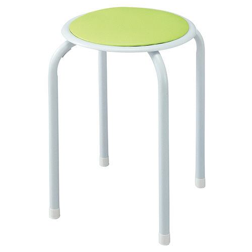 ●5脚までスタッキングできる丸型スツール。座面はライトグリーンです。