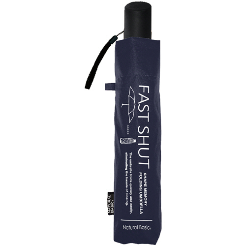 ●閉じた瞬間にきれいな状態になる「シェイプメモリー加工」で畳む煩わしさを軽減します。色はネイビーです。