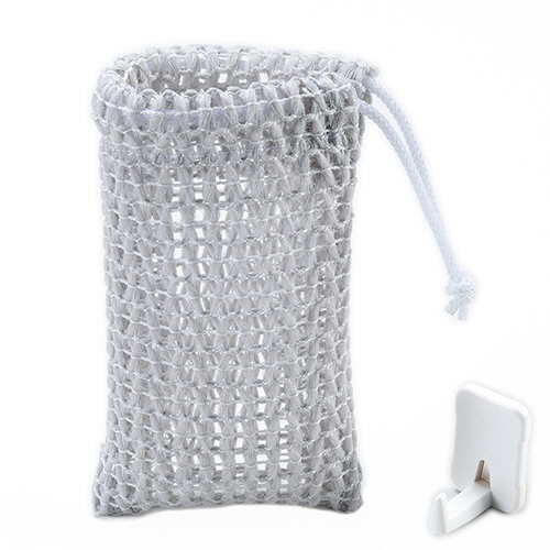 <パッケージ>お手持ちの洗濯石鹸を入れて使用できる。ヒモで吊り下げられる。吊り下げられるフックが付属。