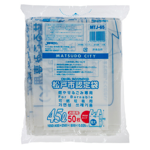 ジャパックス 松戸市 指定ごみ袋 可燃 手付き 白半透明 45L MTJ−65 1パック(50枚)(お取寄せ品)