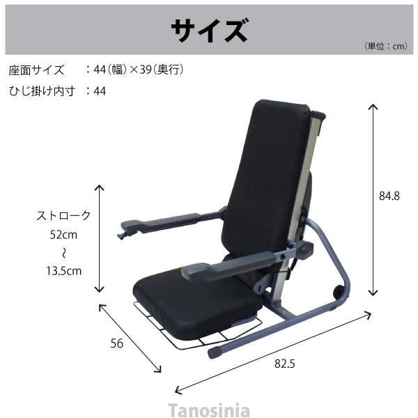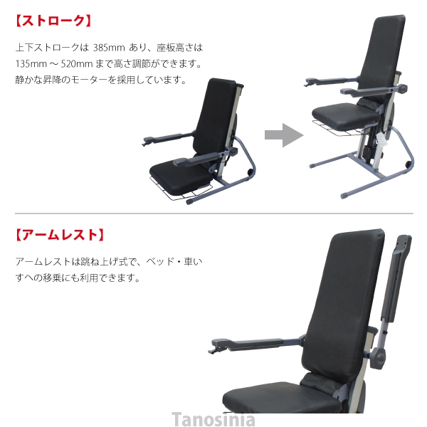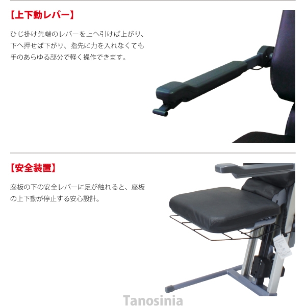 ・レバー操作ひとつでいすが上下動するので、腰・ひざに負担をかけず立ち座りができます。