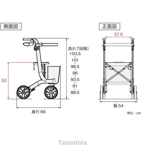 ●サイズ/幅54×奥行65×高さ88.5〜103.5(7段階/2.5cm)cm、折りたたみ時:幅26×高さ88.5〜103.5cm、座面:幅39×奥行21cm、座面高:53cm