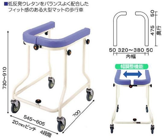○低反発ウレタンをバランスよく配合したフィット感のある大型マットの歩行車