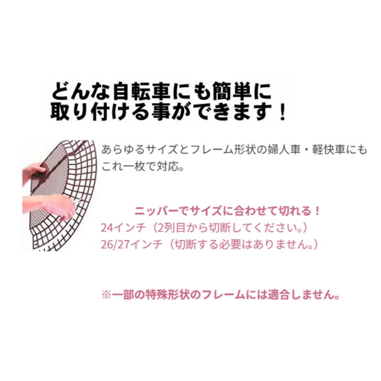 あらゆるサイズとフレーム形状の婦人車・軽快車にもこれ一枚で対応。