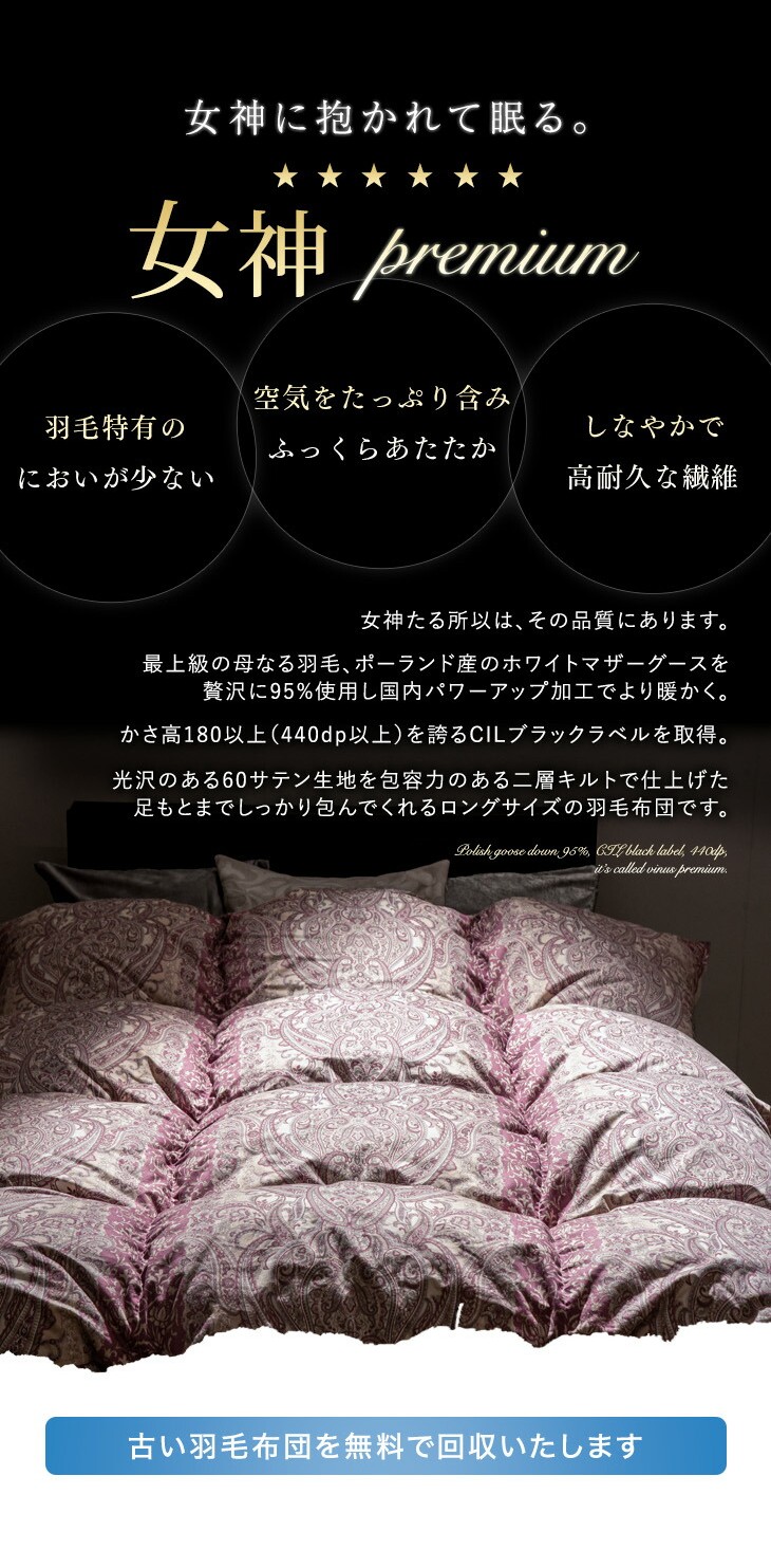 ※羽毛は天然素材のため無臭ではございません。開梱直後や温度・湿度等の環境等により臭いを感じる場合がございますので、開封直後には風通しの良い場所での十分な陰干し等をお勧めいたします。