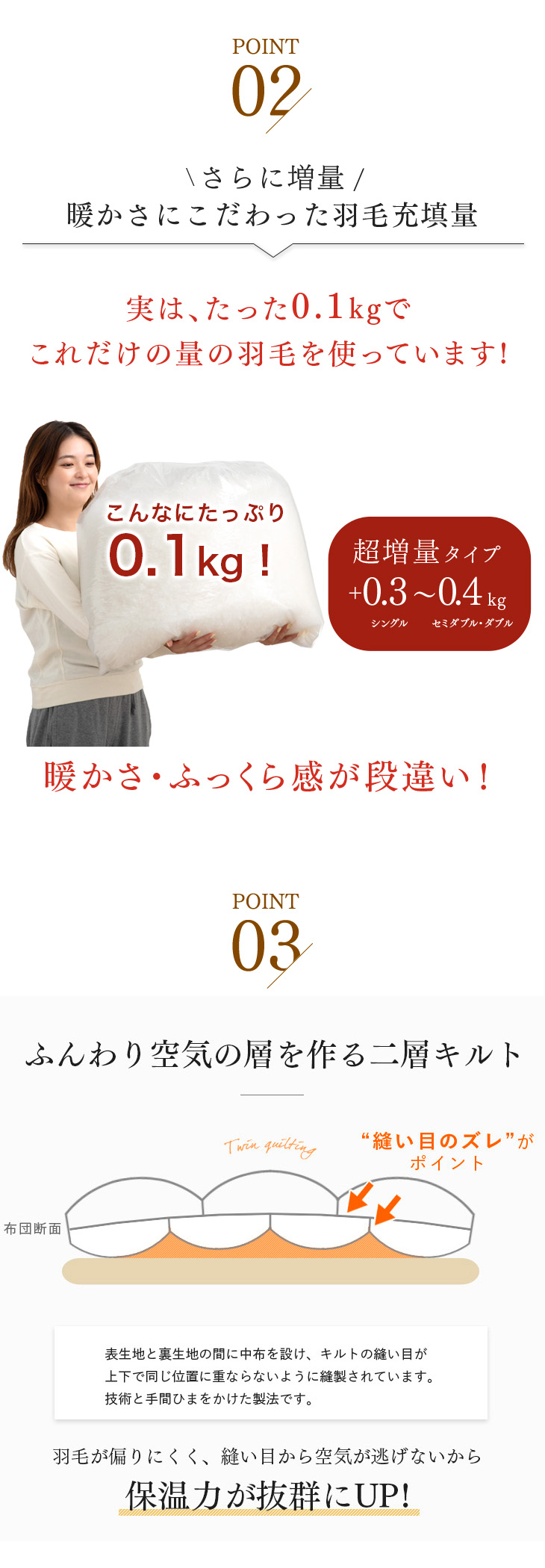 詰め物:ホワイトマザーグースダウン95%、フェザー5%