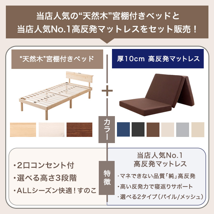 シングルベッド マットレス付 厚10cm 高反発マットレス ベッド すのこベッド シングル コンセント付き 木製 宮付き ベット マットレスセット