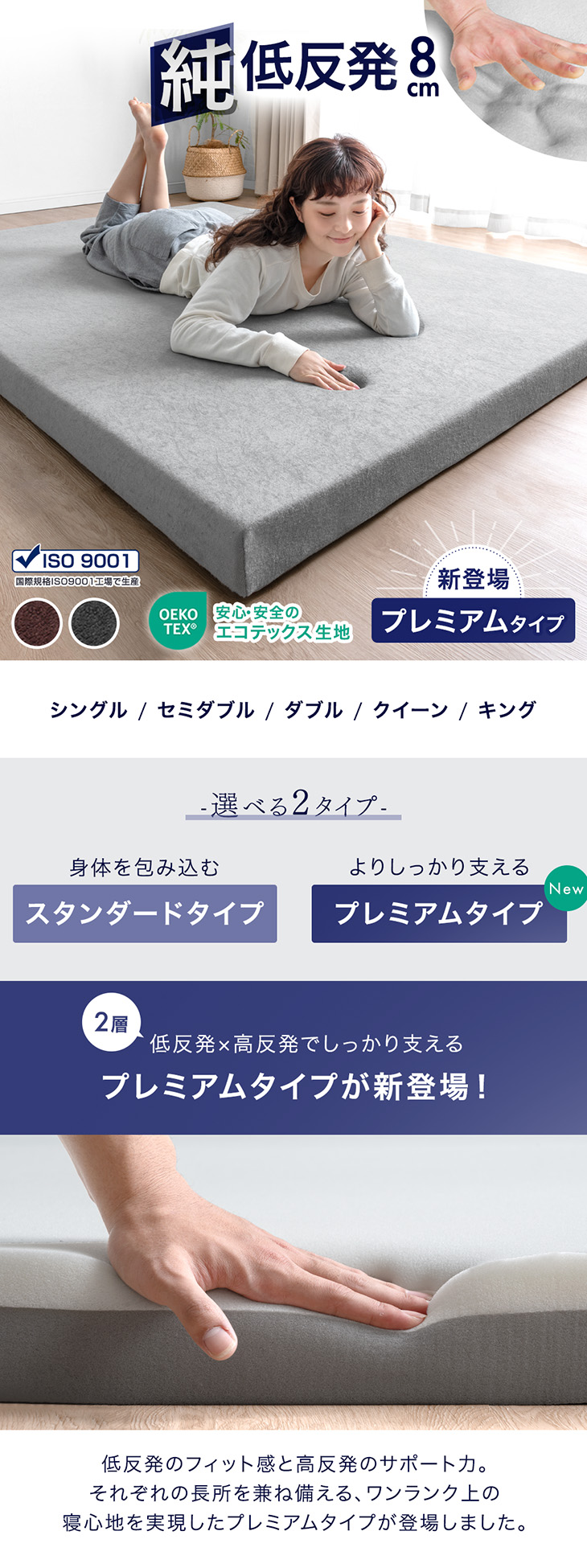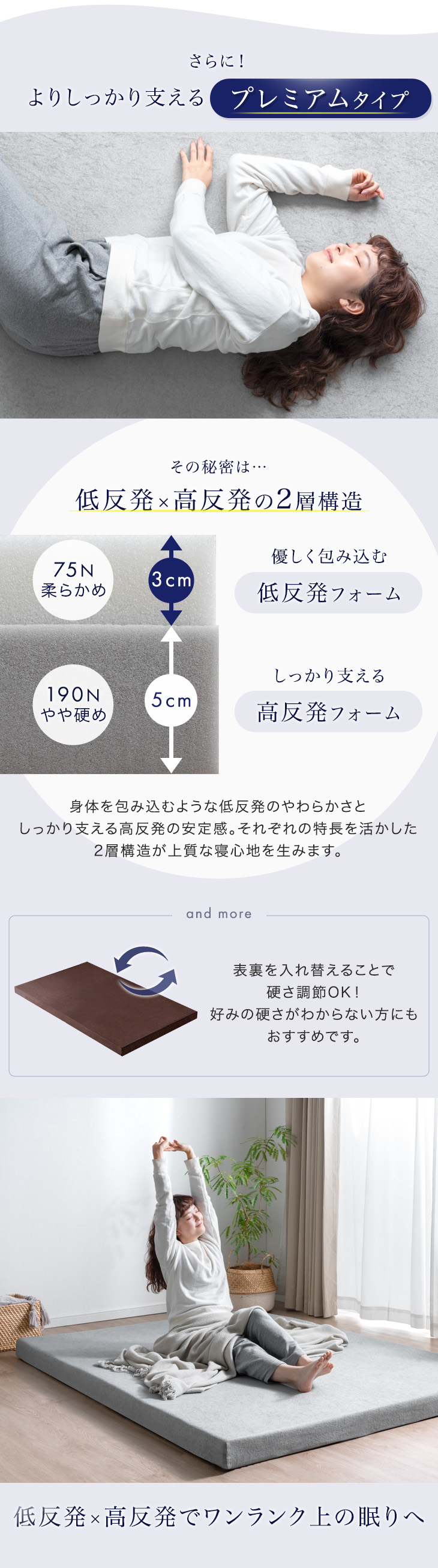 低反発ウレタン3cm(硬さ75N)+高反発ウレタン5cm(硬さ190N)