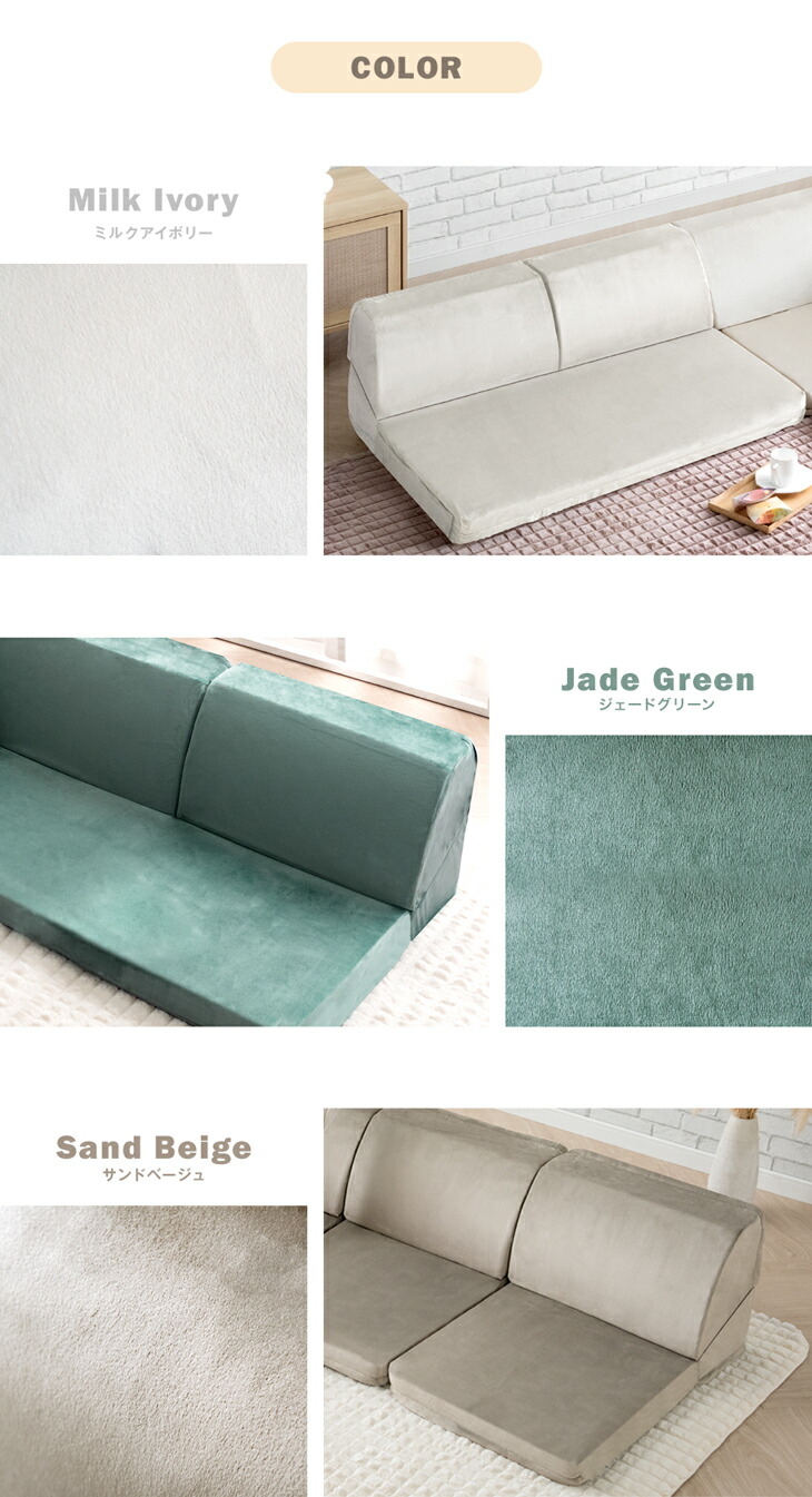 サンドベージュ、ジェードグリーン、ミルクアイボリー