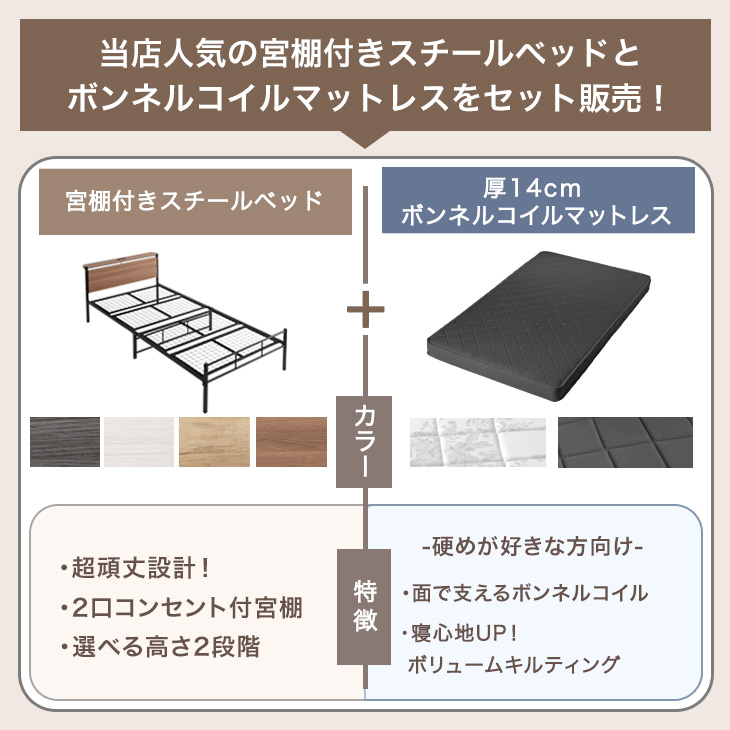 ベッド マットレス付き 厚14cm ボンネルコイル シングルベッド パイプベッド シングル コンセント付き スチール 宮付き ベット マットレスセット