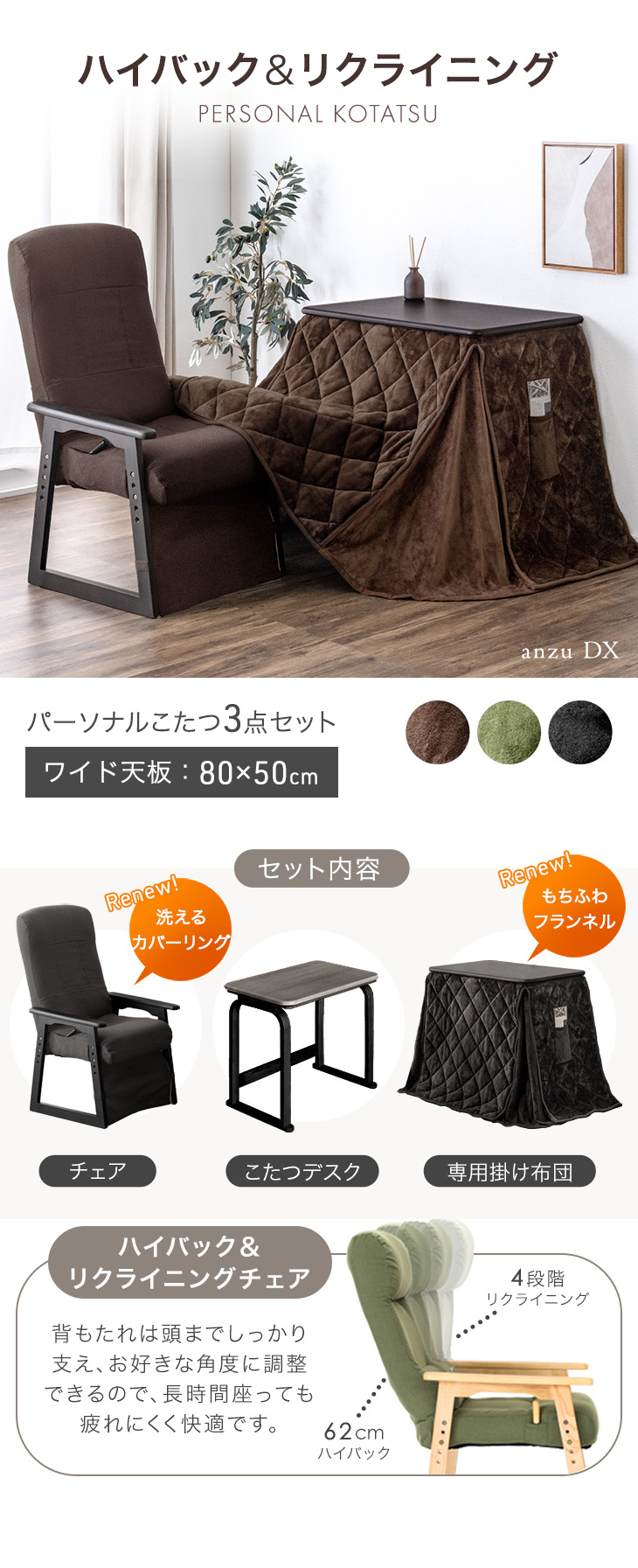 こたつ パーソナルこたつ 3点セット こたつセット 80×50 長方形 一人用 高さ調節 おしゃれ リクライニング ハイバック