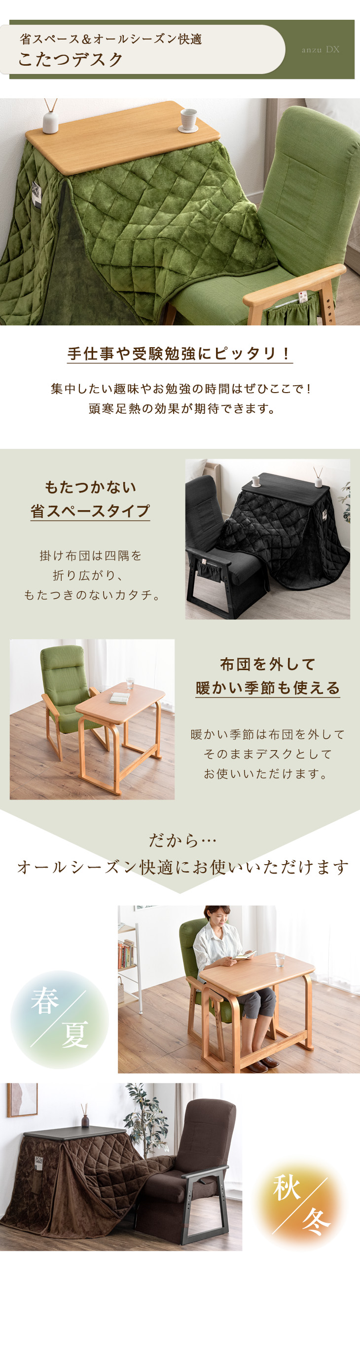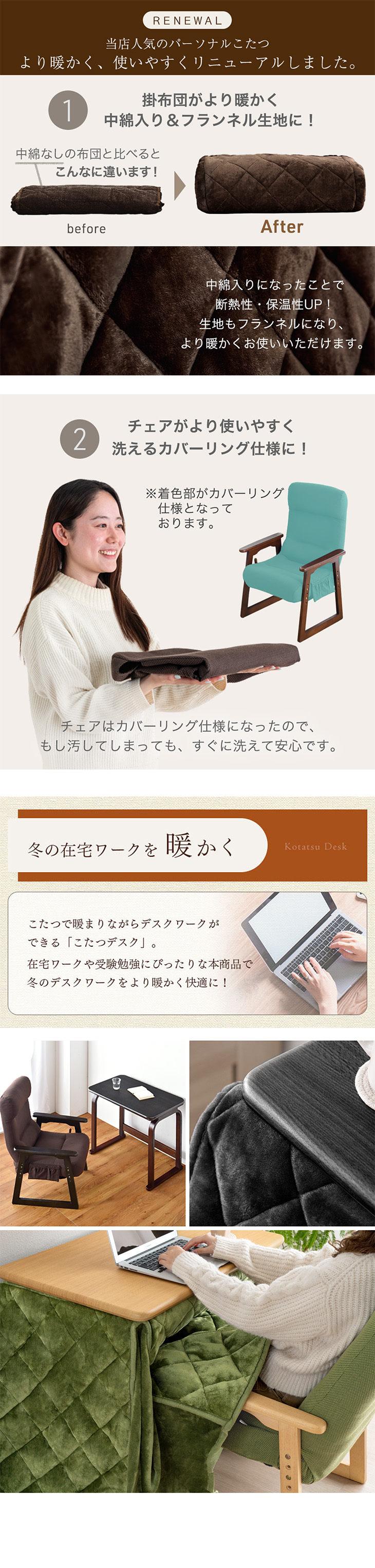 ※2025年9月18日より、こたつ布団の生地をジャガード織りからフランネル生地へリニューアルしました。また、チェアはカバーリング仕様になりました。