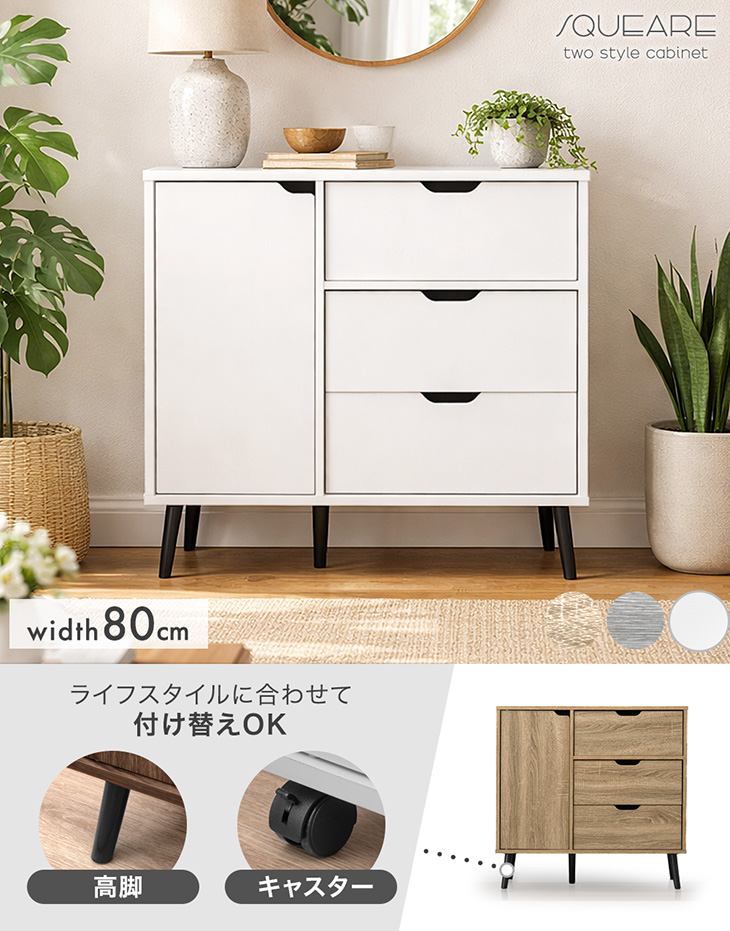 キャビネット 木製 サイドボード チェスト 収納棚 おしゃれ サイドチェスト 幅80 白 リビングボード 北欧 扉 引き出し 収納 大容量 キャスター 扉付き