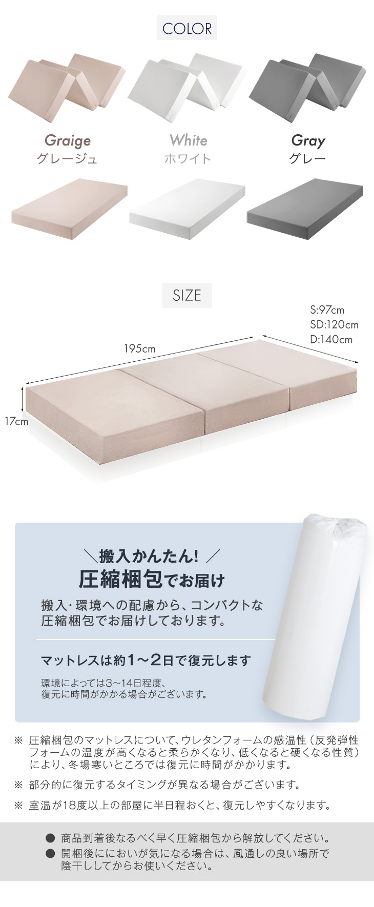 ※マットレスは約1〜2日で復元します。気温や温度により3〜14日かかる場合もあります。